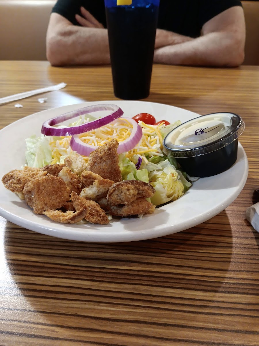 Had the large beer battered fish dinner. excellent!! She had chicken strips and they were huge.. also had hot pepper cheese ball.. believe me when I say you get fed when you're there. Didn't get dessert though but they looked amazing!